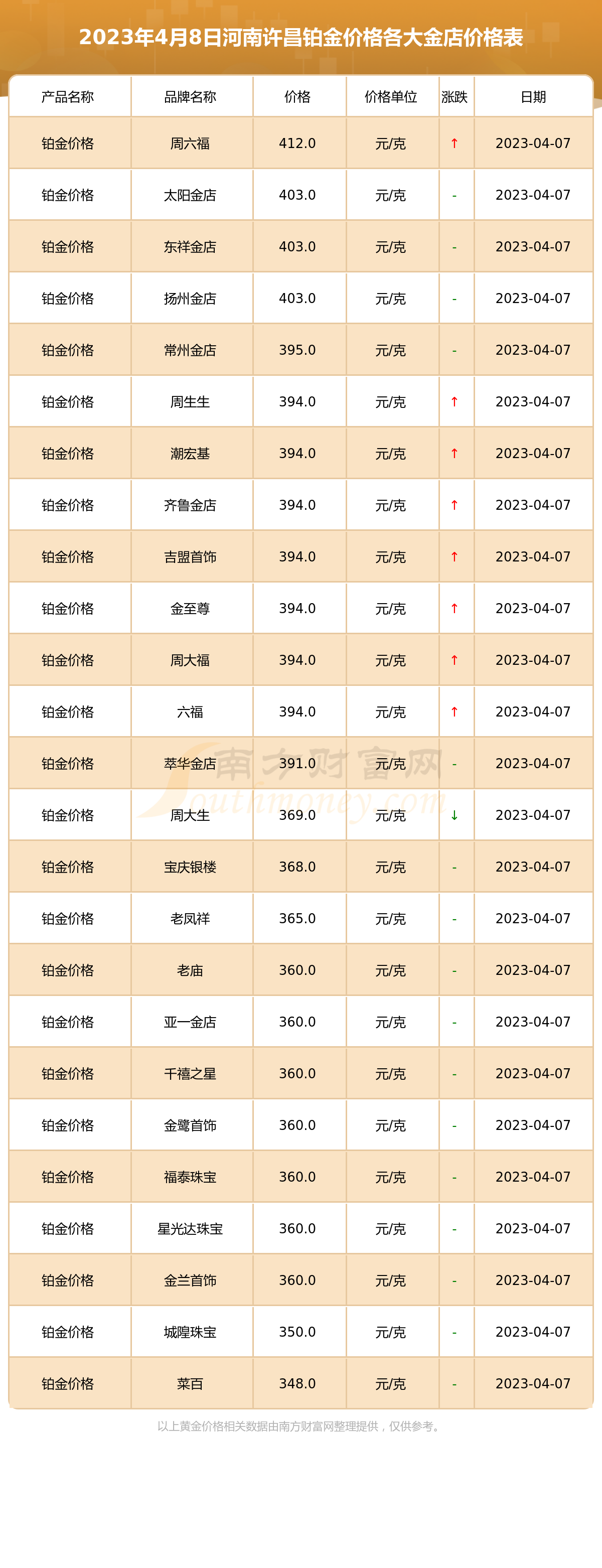 2023年4月8日河南许昌周大福、周六福、六福、菜百、老庙、周生生、潮宏基、周大生、亚一金店、宝庆银楼、太阳金店等各大金店品牌铂金价格最新价格如下:周大福铂金价格394.0元/克,周六福铂金价格412.0元/克,六福铂金价格394.0元/克,菜百铂金价格348.0元/克,老庙铂金价格360.0元/克,周生生铂金价格394.0元/克,潮宏基铂金价格394.0元/克,周大生铂金价格369.0元/克,亚一金店铂金价格360.0元/克,宝庆银楼铂金价格368.0元/克,太阳金店铂金价格403.0元/克。