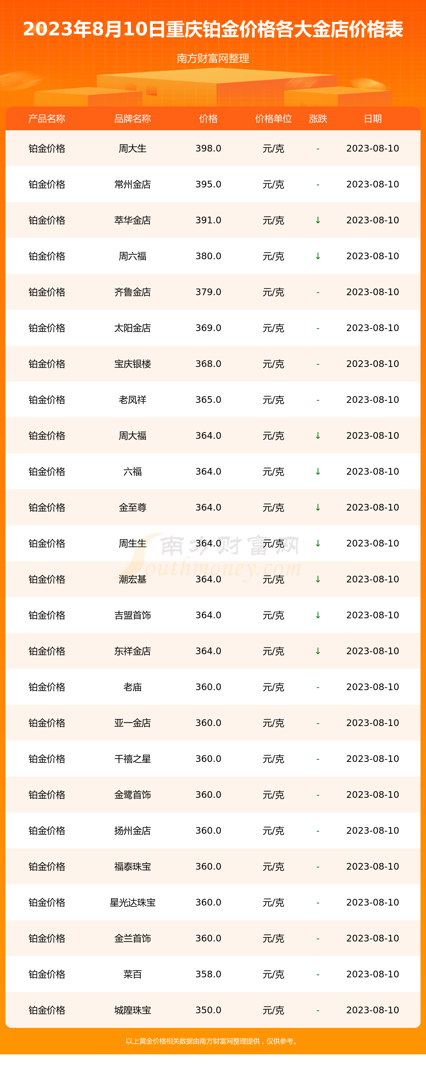 今天是2023年8月10日,重庆周大福、周六福、六福、菜百、老庙、金至尊、周生生、老凤祥、潮宏基、周大生、亚一金店等各大金店品牌铂金价格最新价格如下:周大福364.0元/克、周六福380.0元/克、六福364.0元/克、菜百358.0元/克、老庙360.0元/克、金至尊364.0元/克、周生生364.0元/克、老凤祥365.0元/克、潮宏基364.0元/克、周大生398.0元/克、亚一金店360.0元/克。