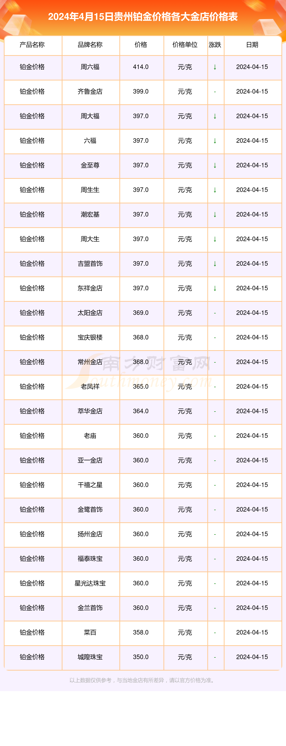2024年4月15日贵州各大金店铂金价格最新价格:周大福397.0元/克,老凤祥365.0元/克,周六福414.0元/克,六福397.0元/克,菜百358.0元/克,老庙360.0元/克,金至尊397.0元/克,周生生397.0元/克,潮宏基397.0元/克,周大生397.0元/克,亚一金店360.0元/克。