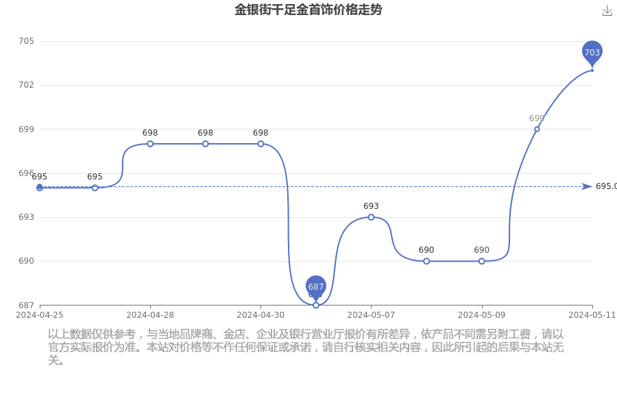2024年5月13日金银街千足金首饰价格是703.0元/克。