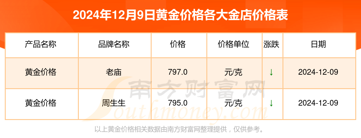 2024年12月9日老庙、周生生等各大金店品牌黄金价格最新价格如下:老庙黄金价格797.0元/克,周生生黄金价格795.0元/克。